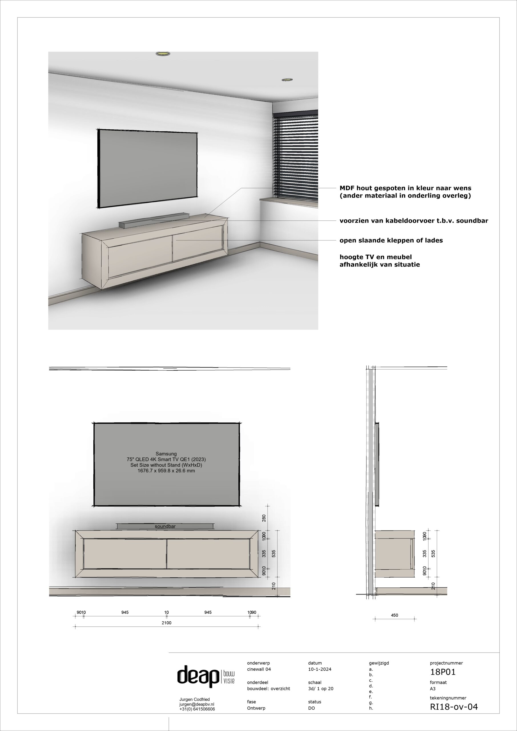 Ervaar het ultieme in stijl en functionaliteit met Deap Furni, het vrij hangende tv-meubel dat klasse uitstraalt. Met strakke details en een krachtig kader is Deap Furni meer dan alleen een meubel; het is een visueel statement. Voorzien van twee opbergruimtes in de vorm van lades en/of openslaande kleppen, biedt Deap Furni een perfecte combinatie van elegantie en praktische opbergruimte.